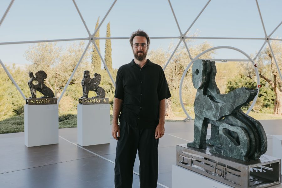 Τα έργα Σφίγγα V, IV και ΙΧ του Πέτρου Μώρη είναι μέρος της σειράς Future Bestiary. πρόκειται για μια συνάθροιση γλυπτών, όπου συστήματα γεωλογικής υλικότητας, ανοίκειας γλώσσας και ψηφιακής παραγωγής αποκαλύπτουν διαπλοκές μεταξύ της μνήμης του υπεδάφους και της μυθικής, κοινωνικής και τεχνολογικής κατασκευής του μέλλοντος. Μια σειρά έργων που αντλούν στοιχεία από ταφικά τεχνουργήματα, μορφές ύπαρξης που θεωρούνται χθόνιοι προστάτες της ζωής και του θανάτου. Οι κρυπτικές επιγραφές που συνοδεύουν αυτά τα τεκτονικά σώματα παράγονται από ψηφιακές αλγοριθμικές διεργασίες νευρωνικών δικτύων και λειτουργούν ως αντανακλάσεις των προφητειών και των αινιγμάτων που μυθολογικά συνδέονται με αυτά τα όντα.