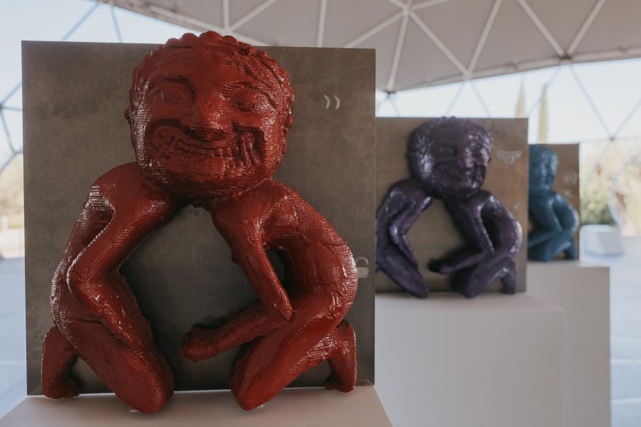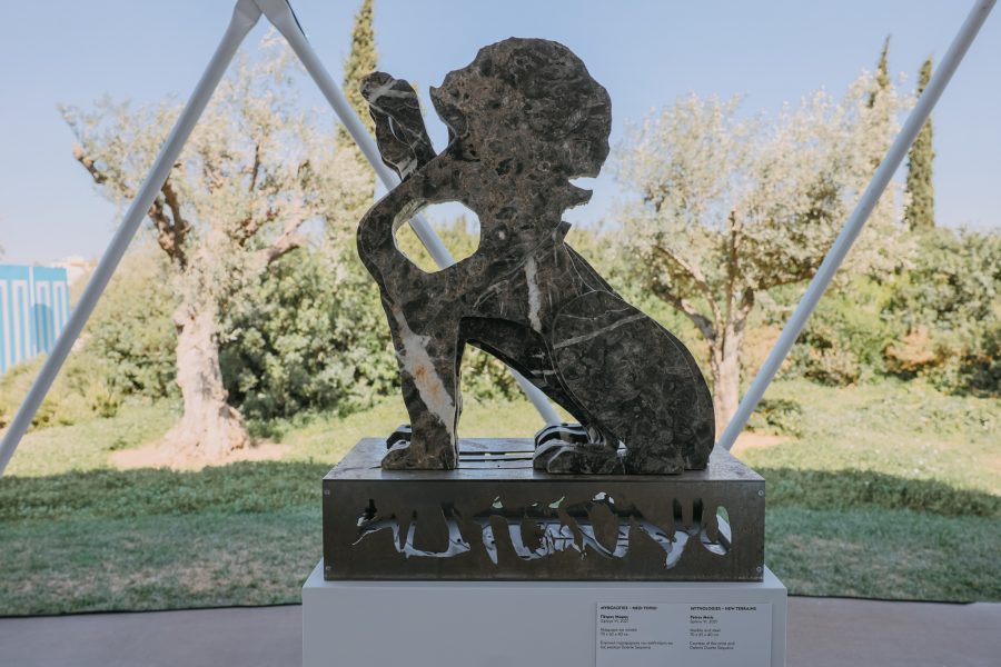 Η έκθεση ΜΥΘΟΛΟΓΙΕΣ | ΝΕΟΙ ΤΟΠΟΙ στον Θόλο του ΚΠΙΣΝ περιλαμβάνει γλυπτά, εγκαταστάσεις και μια εφαρμογή επαυξημένης πραγματικότητας και διερευνά τη μακρόχρονη και πολύπλοκη σχέση μας με τη μυθολογία, καθώς και τον ρόλο που αυτή διαδραματίζει στη βιωμένη πραγματικότητα και στα όρια της φαντασίας μας. 13 έργα σύγχρονης τέχνης αναμετρώνται με την κλίμακα του Θόλου· σε μια κοσμογονία διαφορετική, εμφανίζονται μυθικές φιγούρες που παραπέμπουν στο υπέδαφος, στο ανασκαφικό παρελθόν, στην τεχνολογική-ψηφιακή σφαίρα και στην επιστημονική φαντασία. Τον χώρο επιμελείται αρχιτεκτονικά η Ελένη Παπαναστασίου δημιουργώντας ένα σύστημα καθισμάτων. Η διάταξή τους είναι ελεύθερη, ώστε η κίνηση ανάμεσά τους και στα γλυπτά να μην είναι ιεραρχημένη ούτε καθοδηγούμενη, προκρίνοντας την αίσθηση ότι το σώμα βρίσκεται στο κέντρο μιας σφαίρας.