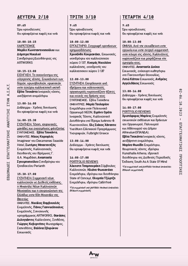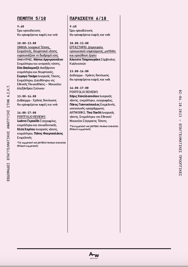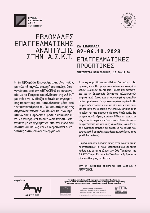 Η 2η Εβδομάδα Επαγγελματικής Ανάπτυξης με τίτλο«Επαγγελματικές Προοπτικές», διοργανώνεται από την ARTWORKS σε συνεργασία με το Γραφείο Διασύνδεσης της Α.Σ.Κ.Τ με στόχο να αναδείξει πιθανές επαγγελματικές προοπτικές και κατευθύνσεις μέσα από την χαρτογράφηση του “οικοσυστήματος” της σύγχρονης τέχνης, των δομών και των πρακτικών της. Παράλληλα, βασική επιδίωξη είναι να ενθαρρύνει τη δικτύωση των συμμετεχόντων με επαγγελματίες από τον χώρο του πολιτισμού, καθώς και να διερευνήσει δυνατότητες διατομεακών συνεργασιών.