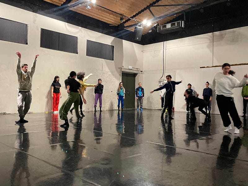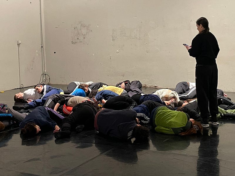 As Maaike Bleeker³ suggests in her seminal book, “the adjective theatrical can refer both to a particular quality―its being ‘of the theatre’―and to failure: its failure to convince as authentic and true. Thus, the staged character of the theatrical event makes it by definition antithetic to modernist notions of authenticity and truth, so much so that theatre is marked by anti-theatricality. Her elaboration of the concept of ‘visuality’ is not so much to condemn the theatrical but to expose that the very fact of seeing always consists of seeing more/less than what it is ‘there’ to see. Instead of opposing the two realities―the staged and the real― the question lies exactly in how the real is (already) staged, allowing certain representations while others remain impossible. To bring back the conversation to Waierstall’s workshop, I am suggesting seeing plural/singular not as opposing, as if in ‘many’ we could automatically see a staged version of plurality, but as a way to elaborately perceive negotiated moments and heightened qualities in a choreographic score as moments of ‘dramatization,’ eventful encounters through which subjects (not necessarily singular) emerge. So, during the workshop, one could experience entrances and exits, highly articulated soli, joint intentional actions―such as the group jump―in which individual bodies focused on the same joint goal and through their concentration became one ‘higher-level entity.’