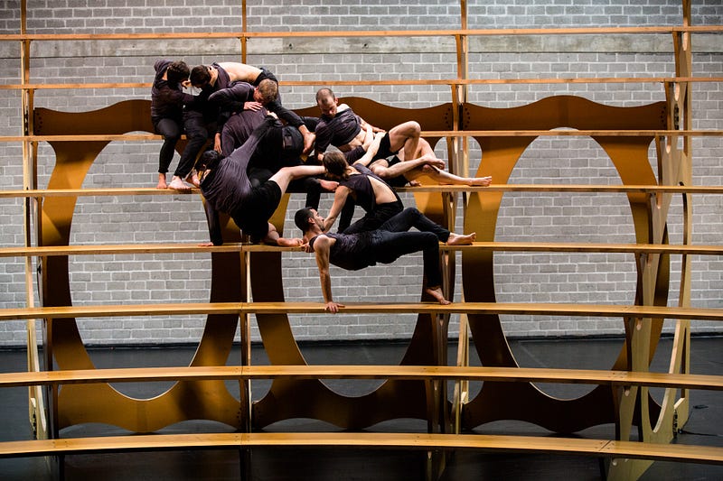 While the score is practiced during the workshop, one could observe how the space ‘breathes’ and how the highly trained dancers bring in different intensities every time; this type of floating concentration demands that every-body listens carefully to the evolving structure of the dance, but most importantly this shared attentive process heightens the relation between moving bodies and space. Actually, it becomes evident how both are already in process, namely, how both bodies and space enact relations that could be defined by physical boundaries (what takes place ‘there,’ on the stage) but also by the capacity to affect and be affected; what happens ‘there’ becomes a moment situated in the ‘here and now,’ speaks of the possibility of an encounter. In reference to the aforementioned, what seems to be in the heart of (of the heart of) this process is not so much the division between solo and group action, as if in a settled, pre-structured choreography, but the affective qualities raised within and during the evolving process, as if both bodies and space co-produce one another through gestures, movements, joint actions and stillness. Even though the monumental modular structure is not there, so as to perceive how bodies interact with it and how they are moulded with it by way of their interaction, one could still grasp in some cases the ‘presence’ of the sculpture, its affective traces imbued in the dancers’ bodies.