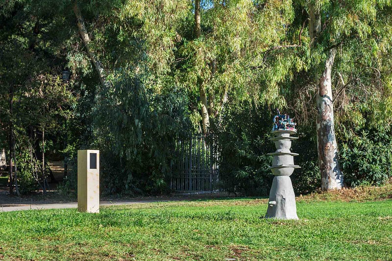 I chose 14 out of the 45, in total, artists who were chosen to participate in the Stavros Niarchos Foundation Artist Fellowship Program in 2019. Among the 14 contributing artists, there were some whose practice had already crossed paths with the ideas of monumentality and the public space or had previously produced sculptural installations. Initially, the exhibition was scheduled to take place at the Stavros Niarchos Park during the Summer Nostos Festival. Unfortunately, however, the latter was canceled on account of the pandemic. As soon as I took up duties as OPANDA’s curator, I immediately decided to include ‘Unhappy Monuments’ to our programming. Besides, one of the goals we have set at OPANDA is to create synergies with other cultural bodies. I discussed my idea with Eleni Chronopoulou, head of the Municipality’s Department of Museums, Collections and Cultural Spaced. She was the one who suggested Parko Eleftherias, which turned out to be an excellent choice.
