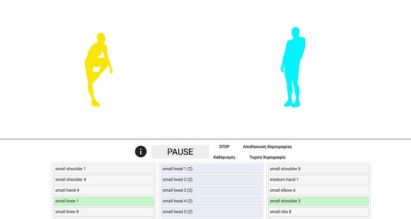 As Stamatia Portanova notes in her book, Moving Without a Body 2, the virtual can be thought of as “an incorporeal potential for variation” and “this unlimited potentiality or infinitely multiple condition of experience is not equitable with any sensed or material continuity.” On this trajectory, hardly virtual interface might be considered a choreographic machine, one that approaches the body as a structured map of (some) possible articulations, which could be then organised into a number of combinations (not infinite). As it was the case with Merce Cunningham’s choreographic practice, hardly virtual seems to be about inorganic, non-sequential movement, with random transitions and no evident continuity; head, knee, ribs, elbow, pelvis, hand, ankle, are only points of departure for the many combinations to come. There is even a “chance” button, using an algorithm to create an aleatory composition, for those who are reluctant to participate mentally/actively in the making.