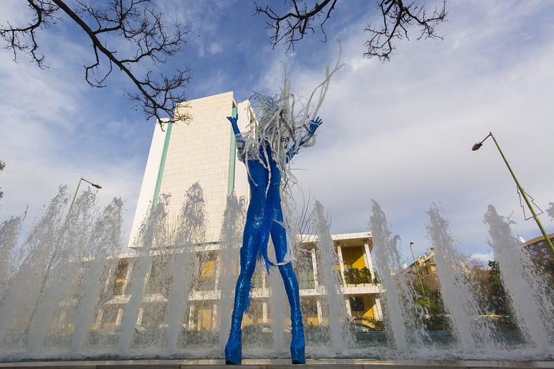 As stated above, ‘exhaustion’ disrupts knowledge in order to invent knowledge. But what does this mean in terms of movement vocabulary and in relation to Sarantopoulou’s work? To answer this question, I would like to propose the concept of the ‘unruly body’―not so much as an accomplished and finite methodology to produce movement, but as a tool to sustain its continued re-examination and to cherish what (sometimes stubbornly) resists knowledge. Moreover, I say unruly to imply a type of dis-orientation that one experiences often in her performances, an invitation to follow her on a trip but without destination, to resist, thus, the very demand of a show, which is exactly to ‘show:’ to exhibit, to make evident, to point at a certain direction. There is no better example than the digital performance ILISSOS / limbo eξótica⁴ which strongly reminded me of Anna Halprin’s Still Dance ―a creative process of “weaving together performance, body art, story, photography and the particularity of a place”⁵ to put it in her exact words. Halprin investigated the impetus of the danced exploration as a form of dialogue between performer and place, rather than a conventional performance that it is often this ‘still point’ documented in pictures. As in Halprin’s captivating images, Sarantopoulou alters the way in which we see herself in relation to the natural/urban surrounds; the digital 3D installation is placed ‘underground’ just like the current of the submerged river Ilissos, emphasizing the sense of entrapment in a dungeon-like environment made of cement. The atmosphere is in sheer contrast with the vivid images, depicting her lean, tall physique in a blue, full-face costume, her figure already in contrast with the surrounding reality―that of the Athenian city-life during the pandemic but also of the many invisible layers of history, still present, unfolding in a parallel universe.