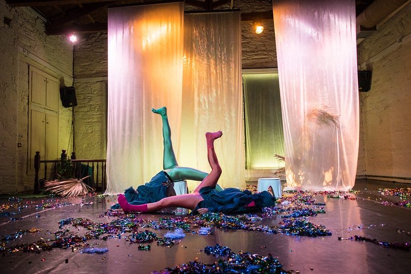 What kind of bodies do we see anyway? In Jamais Vu² they look like a couple of identical preppy school girls, wondering in the space of a gallery, examining the artefacts from Periklis Pravitas’ exhibition, “Déjà visité.” Anyone could be beguiled by their seemingly mainstream look, the two performers would even pass unnoticed if it hadn’t been for their sloppy, uncontrollable limbs and their exaggerated manner, a bit childish at a first glance, a bit frustrating too―you can’t really tell if they are under some spell or if they have been out partying for the last two days. But maybe it is exactly this ‘undecidability’ that characterizes Sarantopoulou’s work; in It’s better in the Bahamas³ we are introduced into an afterparty ‘zone’―or so it seems― a space once marked by a festive occasion, but still not exactly, since whatever it has taken place there it is now over. The two performers linger over the traces of something that was there, wearing their raincoats and glistening leggings to match the colors of the streamers, scattered now all over the stage. The movement is once again sloppy, hands flickering, feet turned inwards, thighs in a V shape, legs unable to support the torso, hunchbacked but still astonishingly agile. There is endurance and errancy, a paradoxical pairing of qualities one might say, nevertheless an engaging one, if we think of the concept of ‘exhaustion’ and the proposed disruption within the artform of dancing.