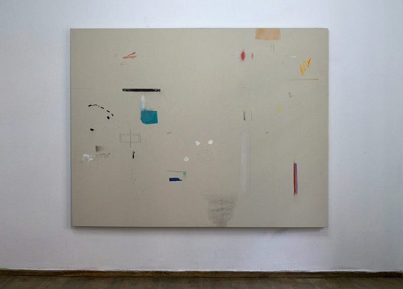 As Niki describes her process of bouncing between a disjointed, photographic mosaic and a unified, painterly whole, my mind wanders to her immense canvas, Dawn, which I saw exhibited at the ARTWORKS exhibition at the Stavros Niarchos Foundation. The work’s largely bare surface is dominated by its empty expanses, broken up by scattered, often solitary forms: a delicate zag of energy here, a soft glow there, an unnameable silhouette resisting definition. The relationship between photographic realism and the painting’s diffuse abstraction seems hard to trace, especially given the underlying subject of her camera’s images. Athens — one of the most chaotic cities where I have ever spent time, a riot of overlapping layers, clashing histories, and churning life — appears unrecognizable as rendered by her brush. Even in the studio-like calm of her apartment, restless street activity periodically interjects; surely her painting has nothing to do with the city we both inhabit?