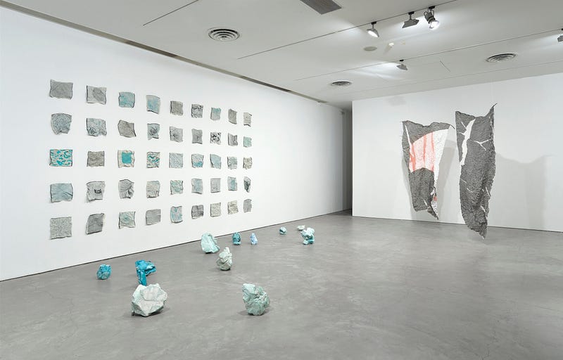 Foteini Palpana (FP): It is great meeting you too, Nicolas, and thank you for this interview. As is the case in this show, my work develops in installations combining different mediums, which tend to become more sculptural over the years. My practice is linked to an interest in categories of the natural environment, such as the ground and the landscape. In the past, my works have adopted the characteristics of the map, the model, the index, or the archive, gradually giving way to artificial environments of geological or even bodily formations.