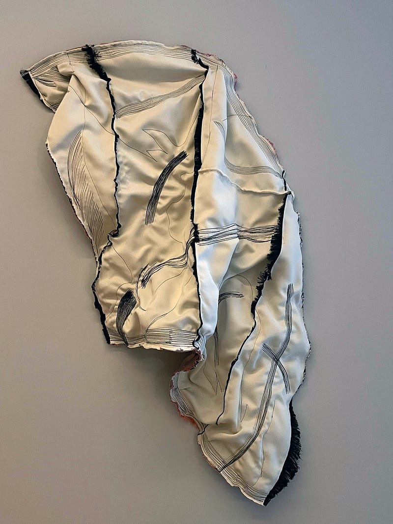 NV: My favourite piece in this show is “View of Us — Soft Sculpture I.” The way you have sewn up the fabric reflects the perpetual shaping of the landscape. But, at the same time, it gives me sartorial vibes, so we return to the body. Could clothing bring a new direction to your research?