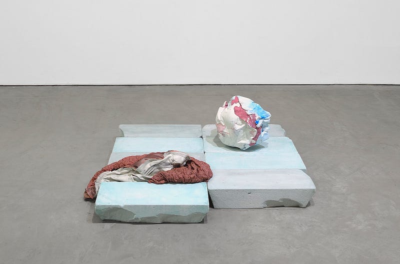 FP: I share a studio with my partner and fellow artist, Giannis Cheimonakis. Although I enjoy my studio space very much, it may remain unused for large periods of time, while there are times when it resembles a construction site. There was this period while working for the show when the space had to be strictly divided into two zones: the messy, muddy, and dusty one and one impeccably clean, where I could work on the fabric pieces.
