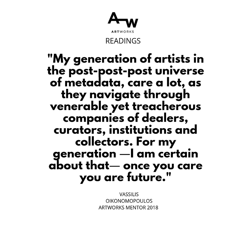 My generation of artists in the post-post-post universe of metadata, care a lot, as they navigate through venerable yet treacherous companies of dealers, curators, institutions and collectors. For my generation ―I am certain about that― once you care you are future.