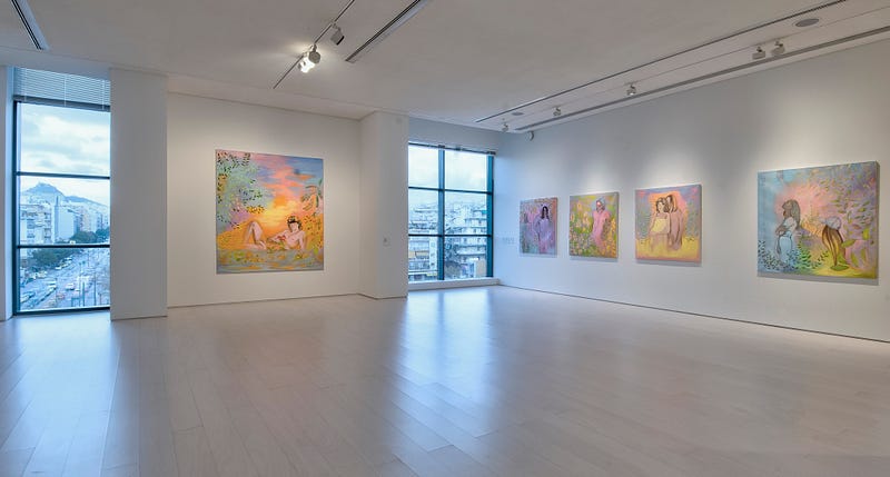 The choice of painting allows the artist to fully present a fantasy that works simultaneously as a means of prevention shield but also as a reaction against the male gaze. These works constitute impulsive exercises that reverse the male gaze that she, like all women, has experienced in public space, and that for personal reasons (and not for the sake of a heteronormative representation) take on a male form in her work. This feeling is extended in the exhibition space, where the visitor becomes an exhibit as she/he is invited to sit on the bench-like seat to experience her work, multiplying the intersections of the gazes.
