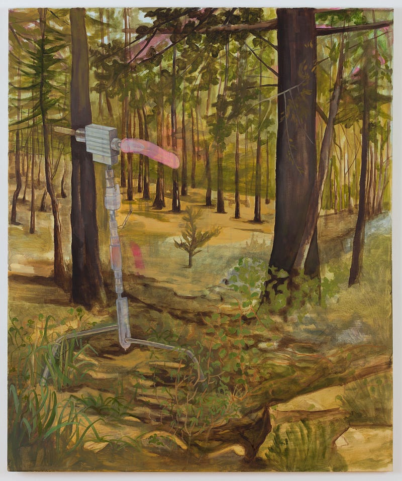 Looking at Eleni Bagaki’s latest series of paintings at the National Museum of Contemporary Art in Athens (EMST) entitled Something like a poem, a nude, and flowers in a vase, I think spontaneously of Celia Hampton’s work. Beyond the fact that both artists represent male nudes from a female perspective, their respective artistic processes intersect at the boundary between life and work. Hampton’s paintings represent close-ups of men’s genitals she encounters during her live chat conversations with strangers on websites from her intimate space, while Bagaki’s work derives from her experience of strolling during working hours in the quasi empty Pedion Areos park, in central Athens. This measured quantity of nature within the cityscape is a liberating background for the artist to project her fantasies and observe the non-verbal communication between its temporary habitants. Inspired by postures of men in advertisements and magazines, the artist places their naked silhouettes in scenes of nature within her work in a palette ranging from pastel yellow, orange, pink to light blue. Their inviting figures, devoid of any aggressive masculinity, appear elusive as they emerge effortlessly through the canvas.