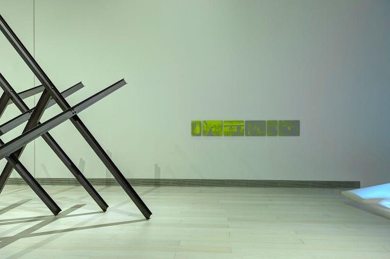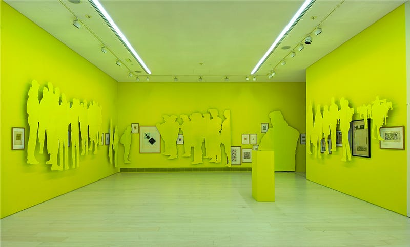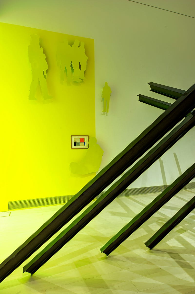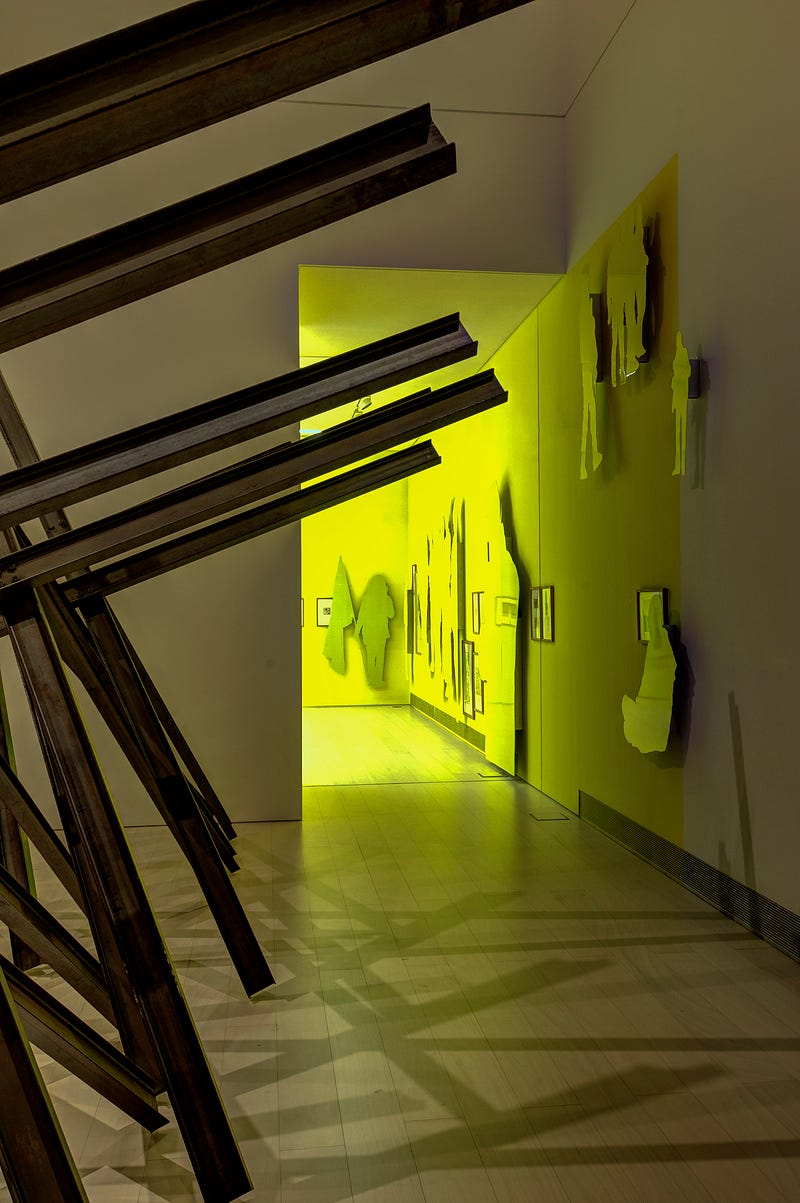 So, all the things are coming together to serve that purpose. All of the decisions are actually made to allow a certain movement. Yellow for example, is one of the colors that has been massively used in modernity, tracing aspects of the contemporary and the movements coming with it, literally and metaphorically. Another aspect — that “serves” this moving purpose, this idea of drama, is the strong fluorescent quality of the color which feels like it can hurt your eyes. Τo me there is something comforting there, that comes with the familiarity that the viewer has with the color, and something discomforting coming with the sharpness of the fluorescent quality of it.