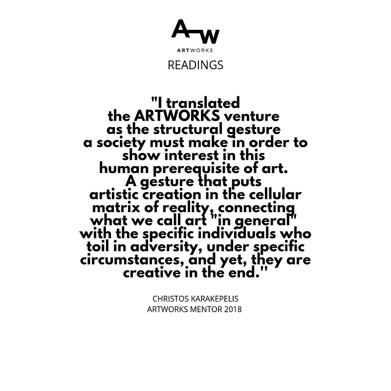 Amidst this chronic deficiency, I translated the ARTWORKS venture as the structural gesture a society must make in order to show interest in this human prerequisite of art. A gesture that puts artistic creation in the cellular matrix of reality, connecting what we call art “in general” with the specific individuals who toil in adversity, under specific circumstances, and yet they are creative in the end. Not less important about this new gesture is that it’s being addressed to young people, so that we get the two poles shaped in synchronicity: a new mindset about cultural policy taking shape at the same time as its subjects, the artists themselves.