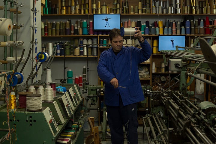 Performance - or orchestrated events - were not always part of Koumianaki’s artistic vernacular. For her solo exhibition Chroachym (2017), curated by locus athens (Maria-Thalia Carras and Olga Hatzidaki) at the MENTIS Center for the Preservation of Traditional Textile Techniques Athens (Benaki Museum), it is the first time that she asks performers to follow a set of instructions she creates. For this project, Pavlina Andriopoulou and Yiota Alexiou were asked to choreographically interpret a score drafted by Koumianaki drawing inspiration from the mechanical movement of the textile machines found at MENTIS. These choreographies were performed, filmed, and presented in the form of videos alongside sculptures.