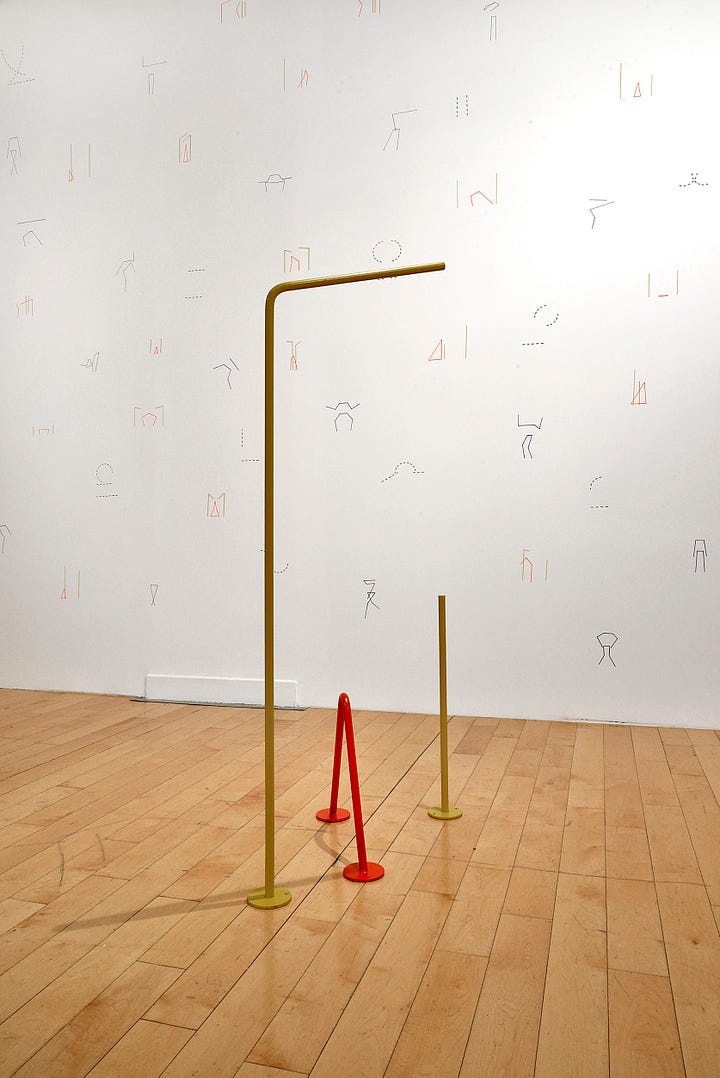 Koumianaki’s approach to performance is indeed not always evident, but remains definitely open-ended. She understands most things as performances but her gestures to highlight that are not always performances themselves. A keystone that often appears in her practice is the creation of interactive sculptures that, through a language of translation and deduction, allude to elements of the Athenian public space. However, the public space she is interested in is the one that has already undergone interventions which make the existence of citizens visible within the ‘set’ they inhabit. In Equilibrists (2016), a group show curated by Helga Christoffersen and Gary Carrion-Murayari and organized by DESTE Foundation, Athens, and New Museum, New York, in collaboration with the Benaki Museum, Koumianaki creates sculptures inspired by the broken railings in the streets of Athens, as well as the handles in public transportation vehicles. At the same time, a mural behind the sculptures serves as a score for the visitors, prompting them to interact with them and reflect on different choreographical and bodily uses of such elements commonly found in the public space.