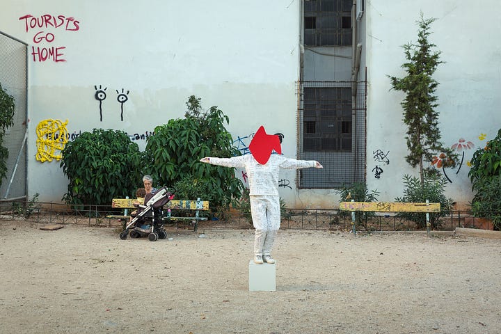 Last but not least, in 2017, together with architect Fanis Kafantaris, she created a map of public space disruptions in the Exarchia neighborhood; its “punctuation marks,” as she often calls them. Consecutively, the two of them brought together museum labels which they placed next to each one of these marks together with mediators that would interact with the audiences, guiding them through the neighborhood.