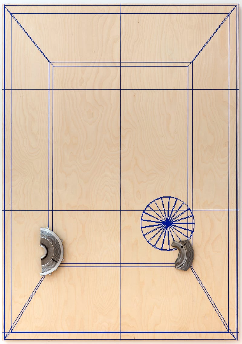 The artistic practice of Theodoros Giannakis is not articulated in well-defined bodies of work. Instead it takes form as a constant flow with no firm beginning or end, not unalike the constant flow of information we are constantly exposed to. In both his solo shows, in Eleni Koroneou Gallery in Athens in 2018 and Union Pacific in London in 2019, there is a sense that that two did not occur in sequence but in synchronicity. The works fuse into others and co-exist with what has been and what can be imagined to be. The artworks seem to be in perpetual progress, only briefly pausing to be displayed till they rematerialize in other contexts, through different iterations that allow for additions and reductions, but mostly a rethinking of their purpose, use and effect. Much like his existential ponderings that have stigmatized an entire generation that can barely remember a life before digitization, time has been rendered redundant: “the Anthropocene heralds a collapse of the distinction between geological time and human time”[7]. In his solo show Primitivism mirage, Giannakis presented a collection of paintings, sculptures and installations. The works manufactured largely with 3D reconstruction, fabrication and default machine learning algorithms retell narratives of the past, present and future in co-existence. A blending of time through recontextualized symbols and mythologies achieves an atmosphere of otherworldliness, simulating past perceptions of futurism, largely drawn from early science fiction novels with an emphasis on William Gibson’s Neuromancer. The repetition of perspective grids in Giannakis’ practice reveals the desire to achieve a continuity, a view towards what is yet to materialize and a belief in the cyclical passage of time. The video installation of a real-time rendering of the continuous alternation of night and day through endless sunsets and sunrises in front of an infinite ocean accentuate this point even if only realistically but never real.