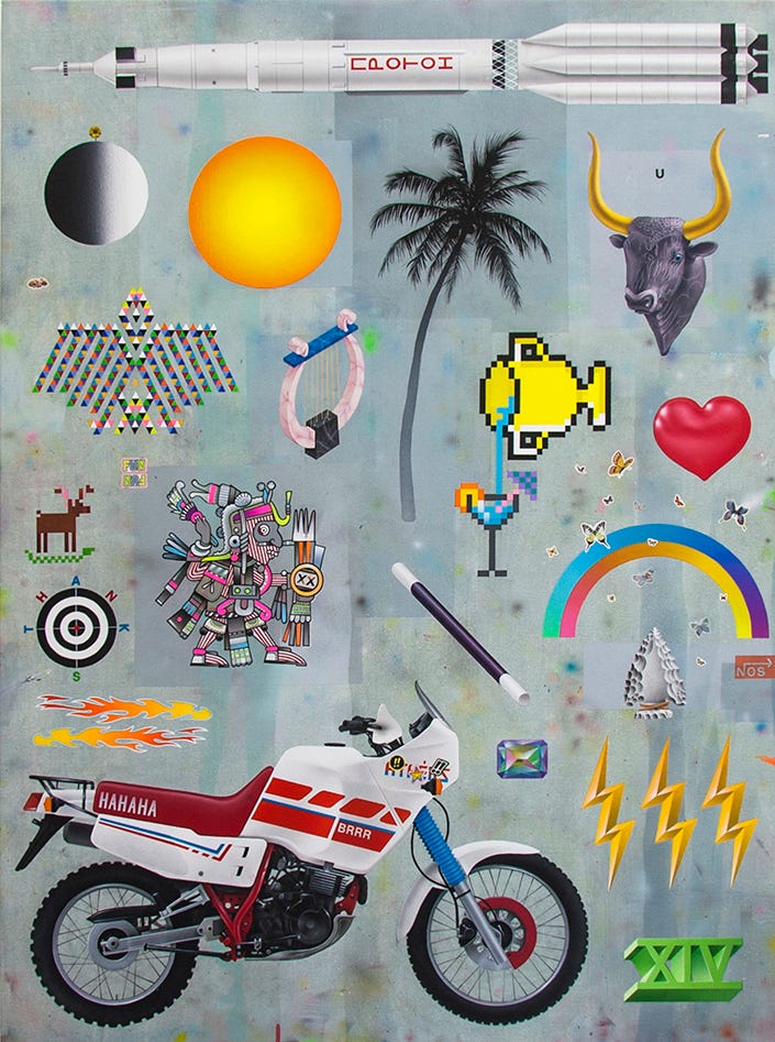 The space and time of the internet and the coexistence of heterogeneous information, symbols and images are clearly evident in the current work of Pavlos Tsakonas. Through unexpected encounters and syntheses, the artist questions the dipoles of religion and science, reason and emotion, art and nature, order and chaos. In a workin-progress inspired by the twelve zodiac signs of Western astrology he comments on the classification systems of human traits. His 12 paintings, one for each zodiac sign, comprise elements from different traditions, eras and cultures and appropriate the aesthetics of online communication as well as those of graphic design and advertising. Can we really avoid the limitations, categorisations and generalisations we tend to use in order to interpret the world? Can we defuse and enervate symbols and “constructs”? The questions posed by the work of Tsakonas seem more crucial than ever. The need for “living classifications” (Bowker & Leigh Start 2000, 326) in times of polarisation and controversy is urgent — which means a need for fluid categories capable of changing to facilitate shifts and transformations.